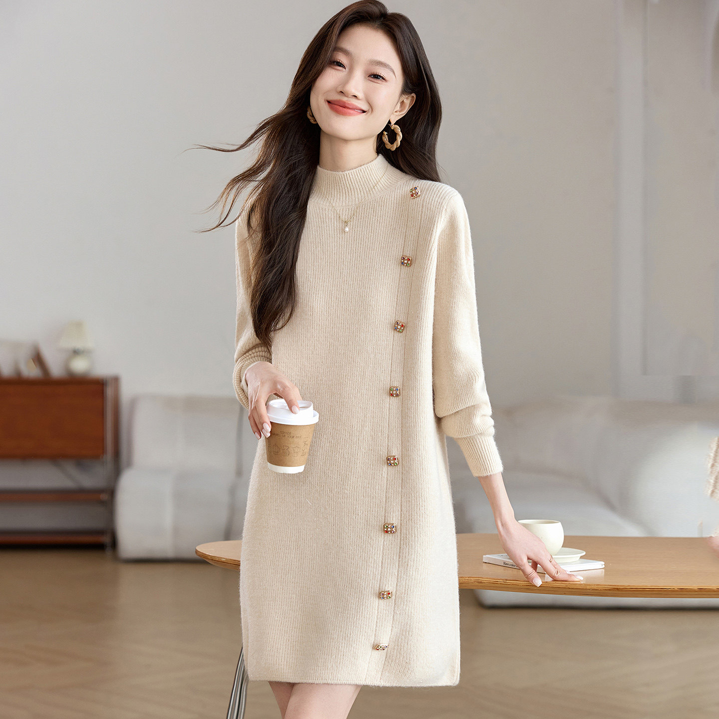 - 中长款高领毛衣