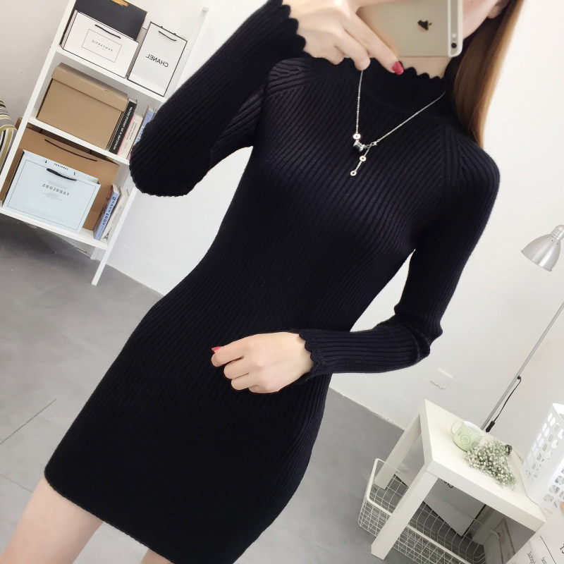 秋冬季新款韩版半高领针织连衣裙女中长款过膝直筒打底衫毛衣裙子
