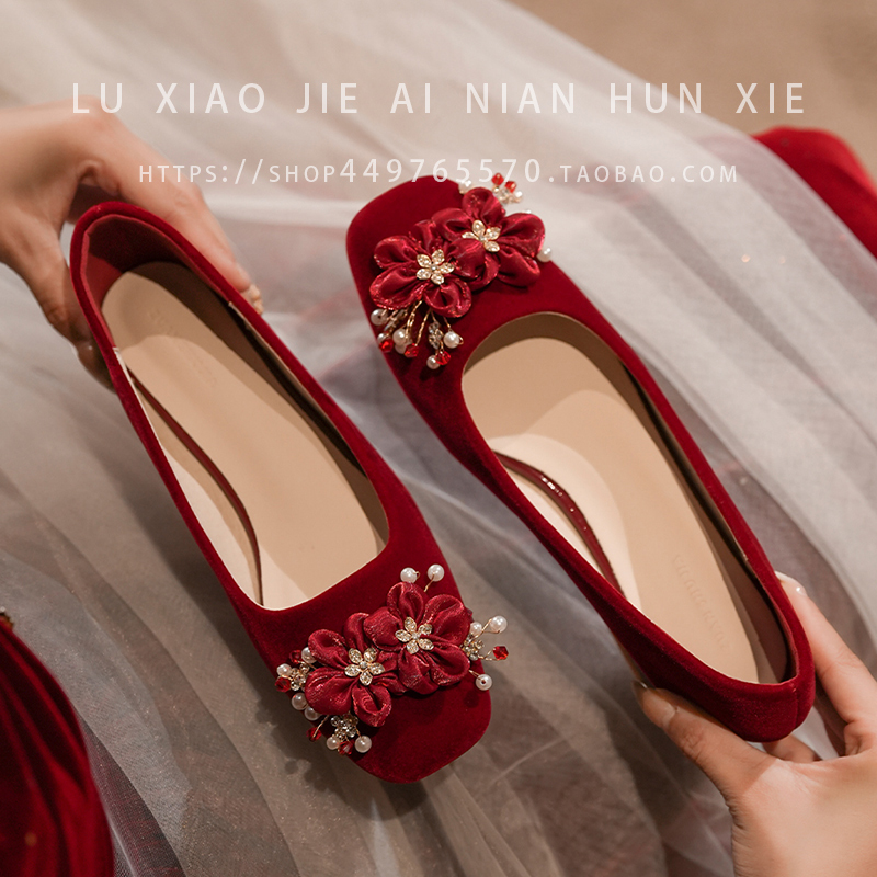 红色婚鞋女秀禾婚纱两穿平底新娘鞋大码孕妇单鞋不累脚低跟结婚鞋