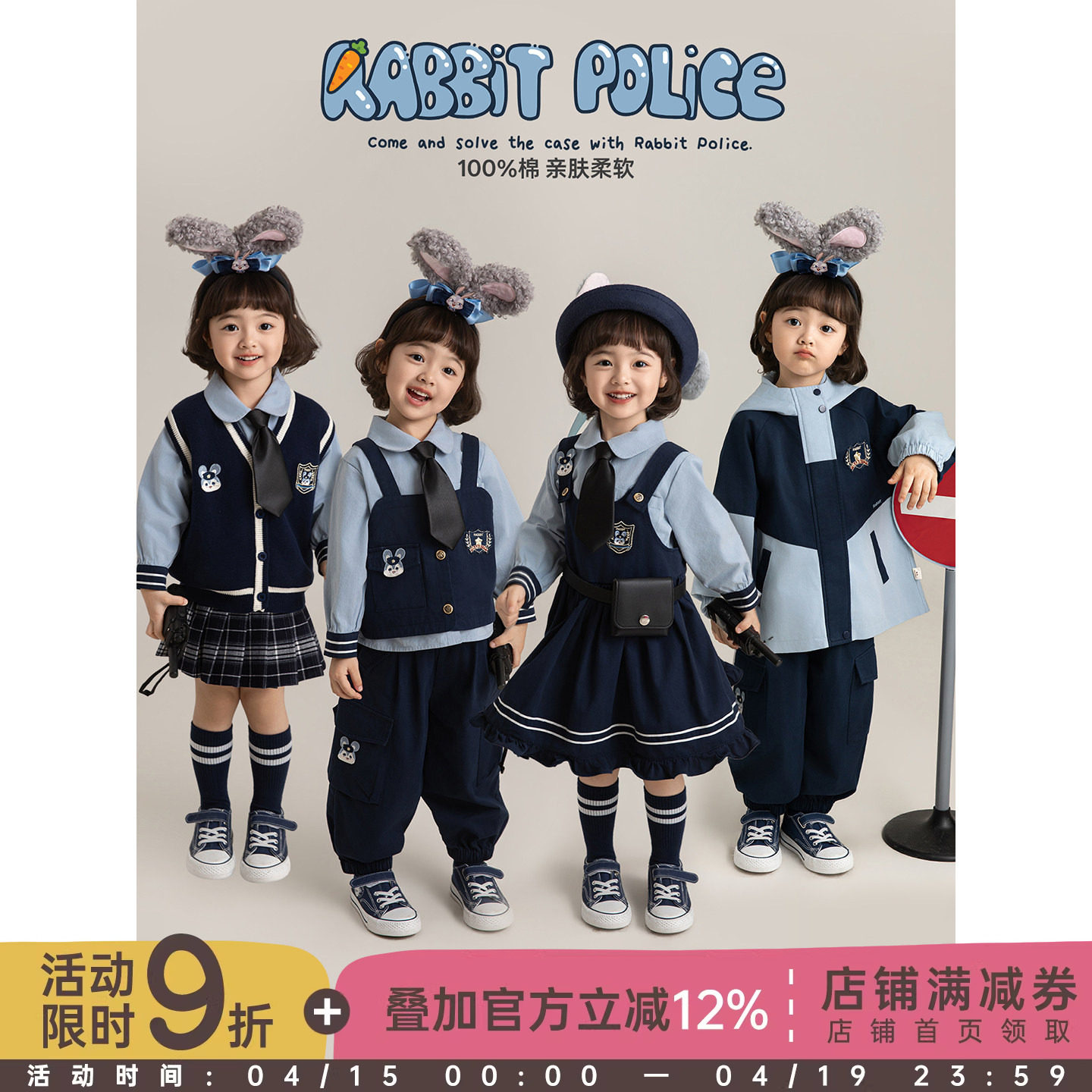 幼悠女童春季新款娃娃领衬衫无袖马甲短裙宽松束脚裤兔子警探套装