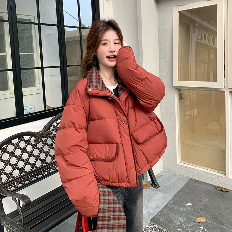 2025冬季新款韩版时尚短款立领羽绒服女设计感格子袖口白鸭绒外套