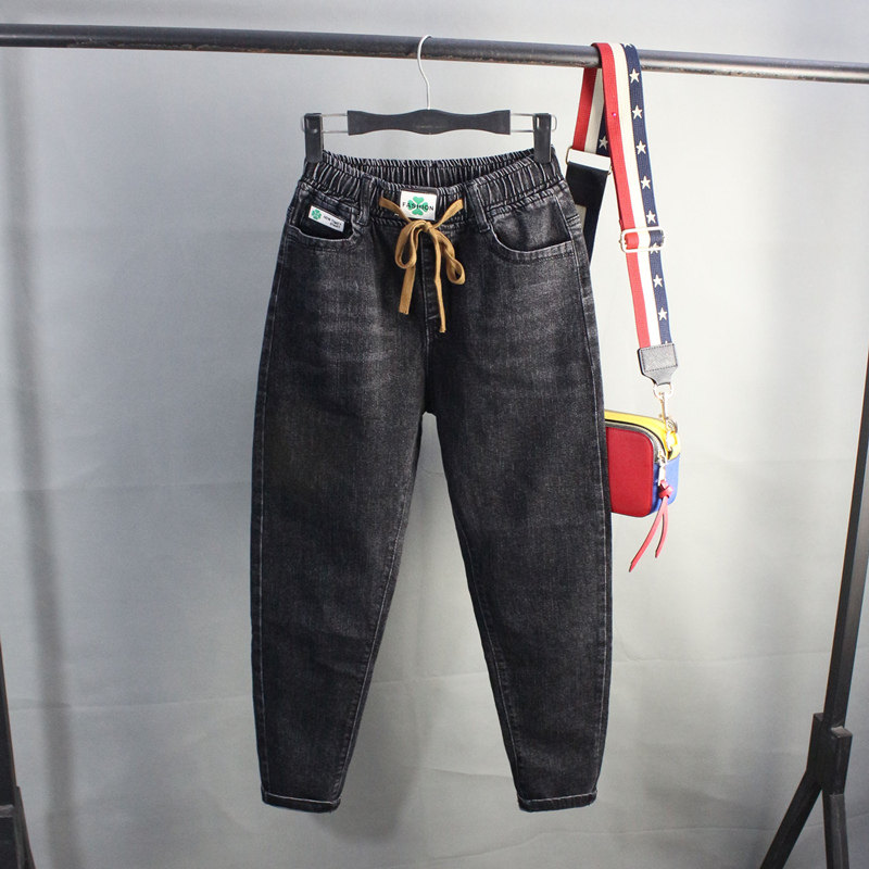女松紧腰宽松哈伦牛仔长裤小脚弹力垮裤显瘦萝卜2022秋冬新款黑色
