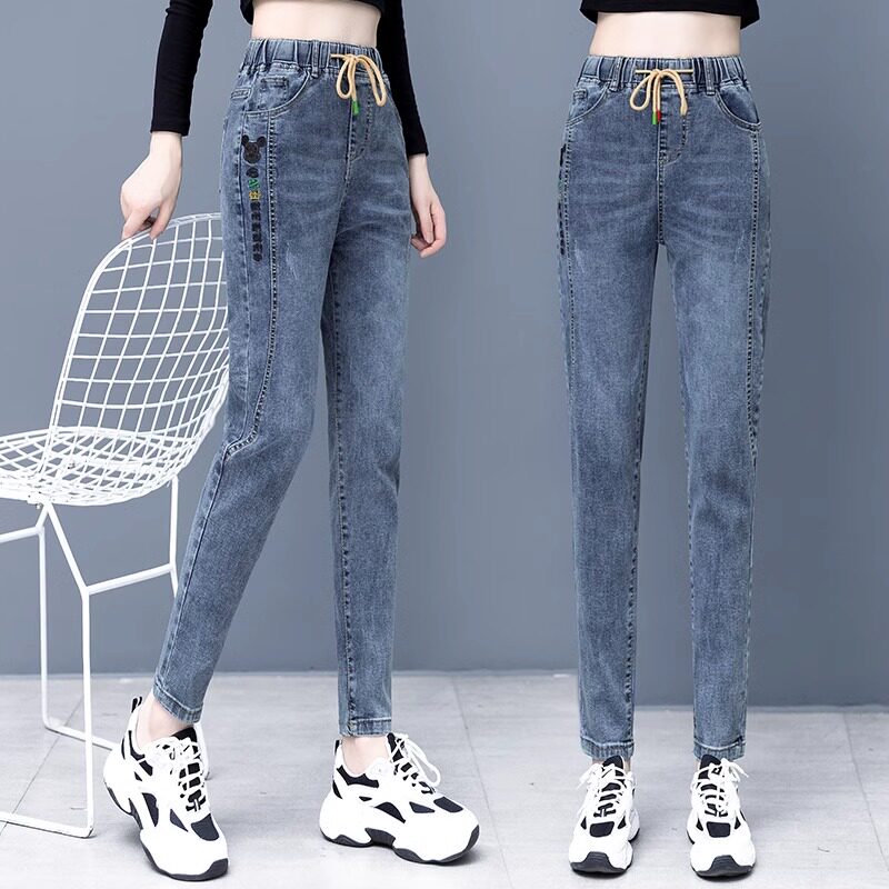 复古刺绣牛仔裤女早秋新款休闲百搭长裤宽松大码显瘦松紧腰哈伦裤