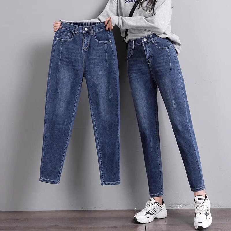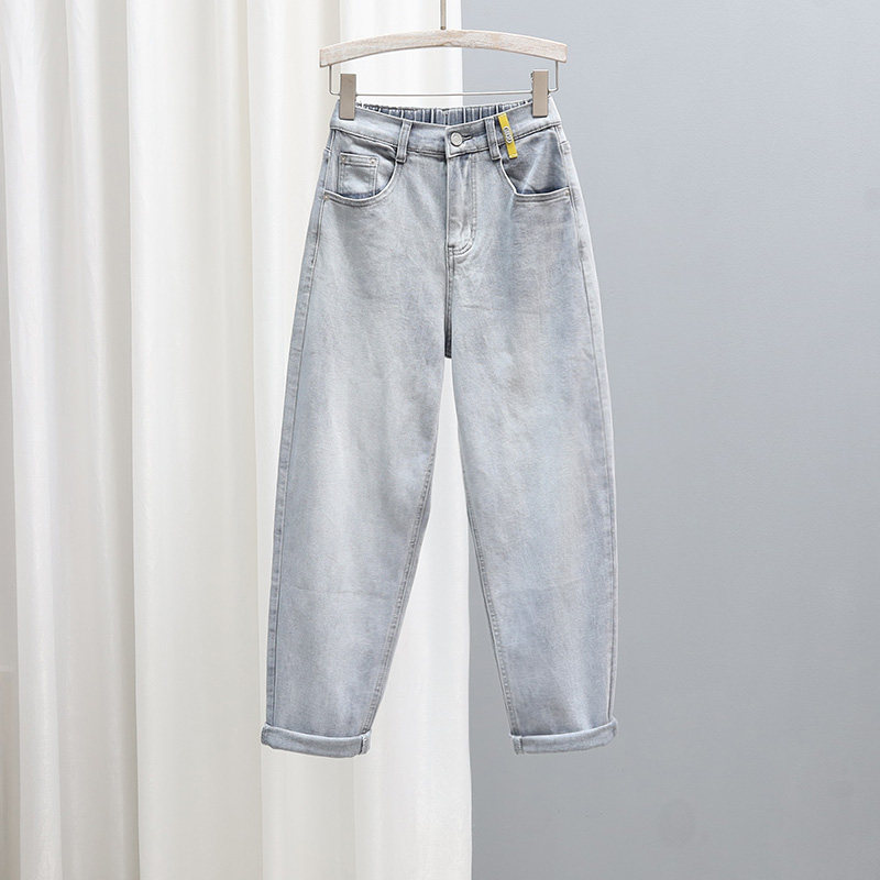 2025春季韩版大码女装松紧腰牛仔裤女高腰哈伦裤长裤bf显瘦小脚裤