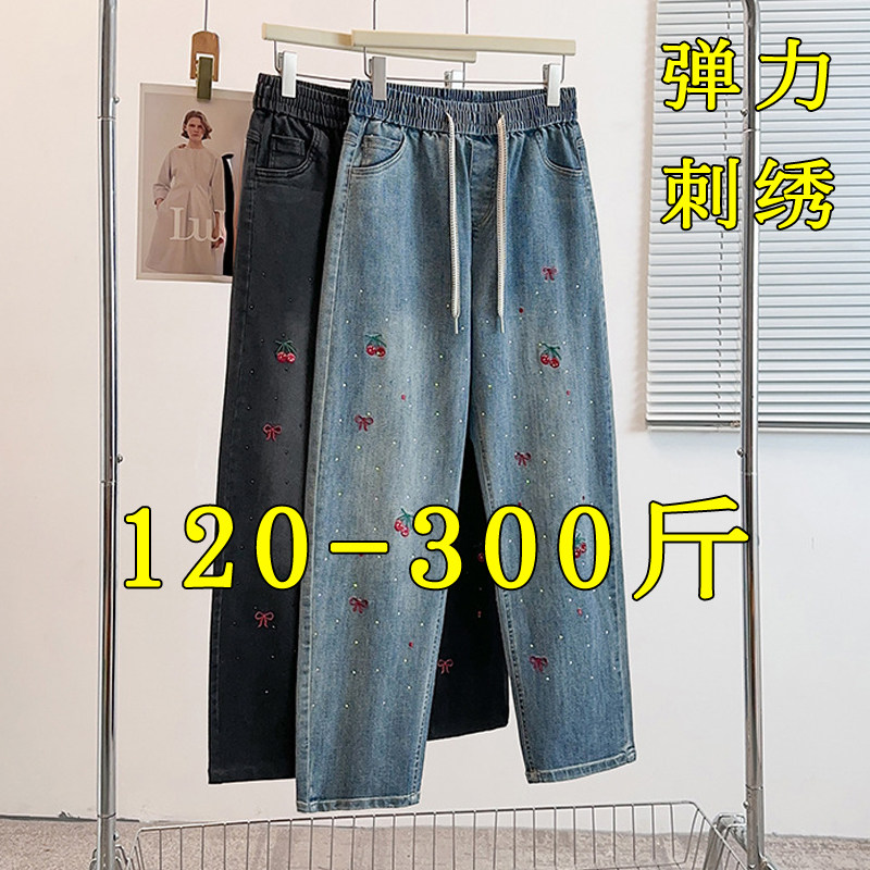 哈伦牛仔裤女大码胖mm2026新款显瘦200斤烫钻刺绣松紧腰长裤子春3