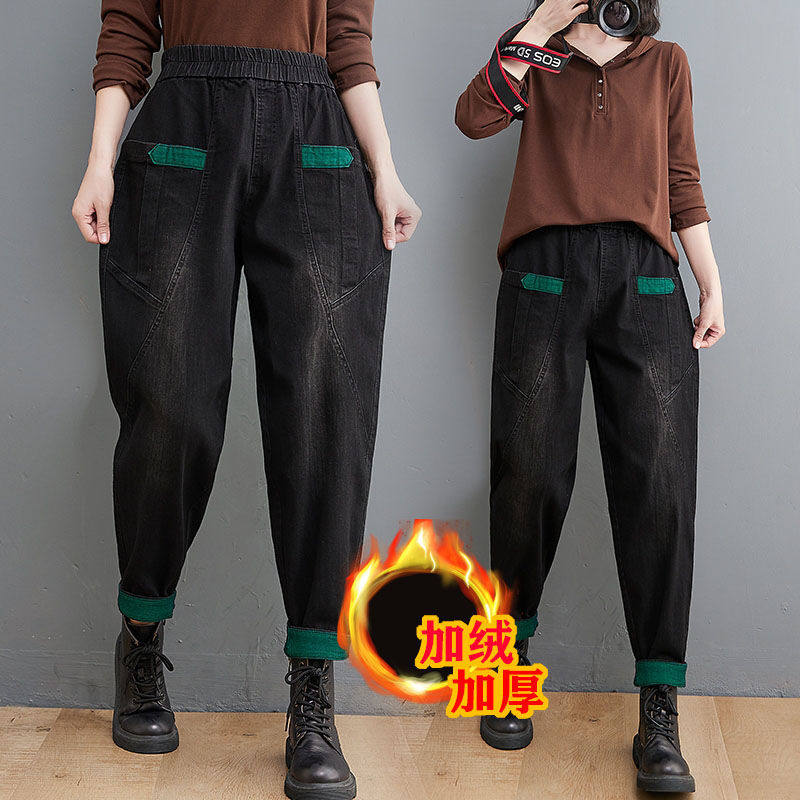 冬季新款松紧腰弹力哈伦加入加厚牛仔裤女显瘦宽松萝卜裤牛仔长裤