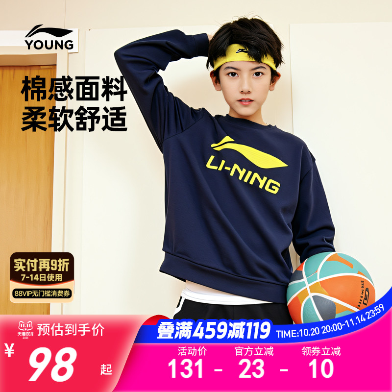 李宁儿童加绒卫衣2025新款冬季男童装女衣服青少年女童中大童冬装