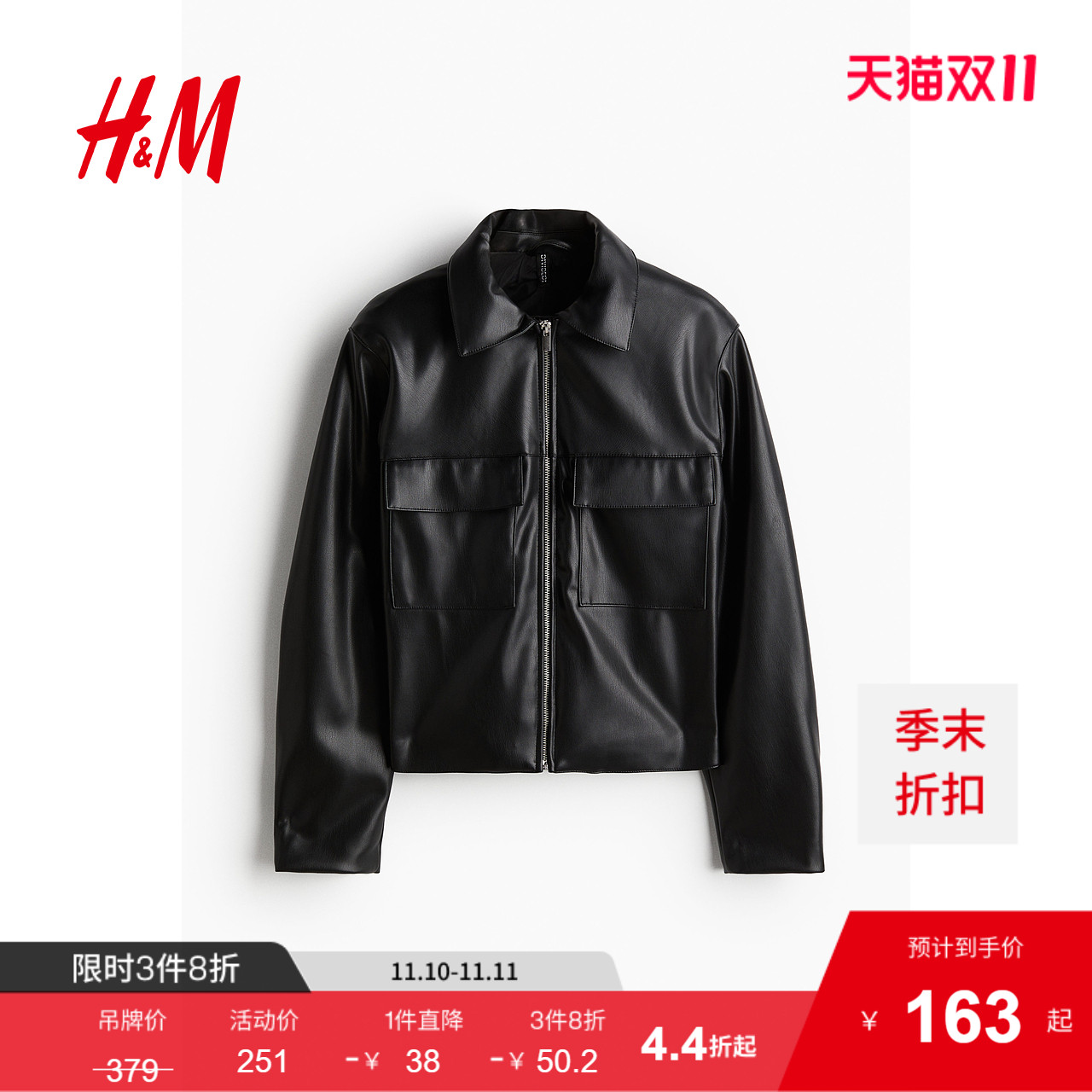 HM女装短外套秋季newvintage新复古风修身长袖黑色皮夹克1254862