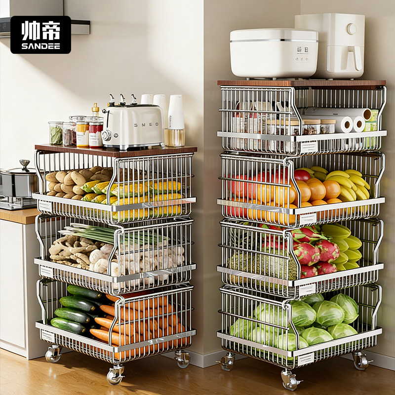 厨房不锈钢蔬菜置物架落地多层家用水果菜篮子收纳筐可移动放菜架