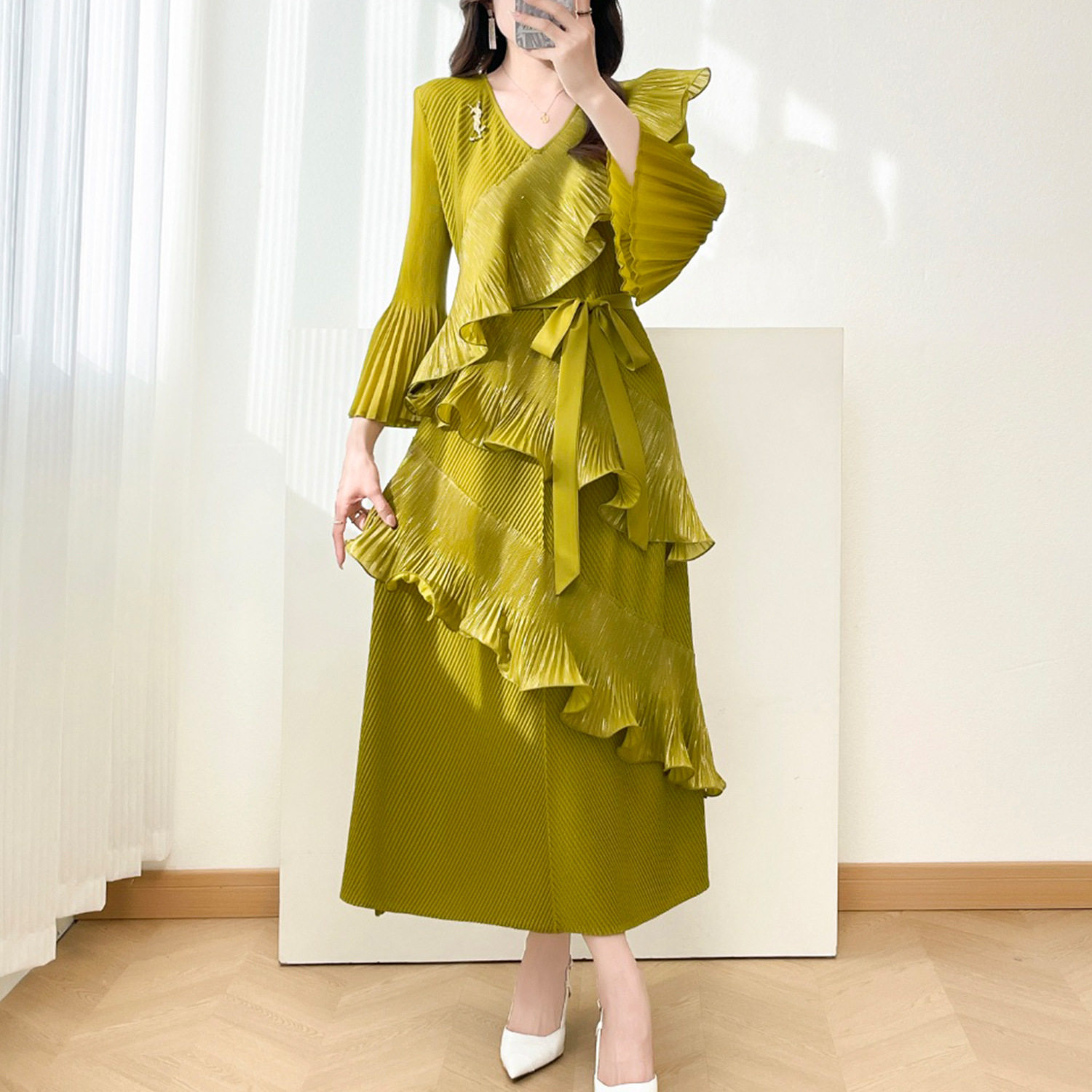 - 喇叭袖 修身连衣裙