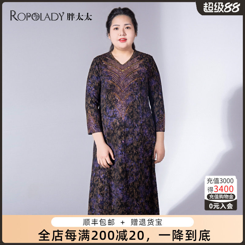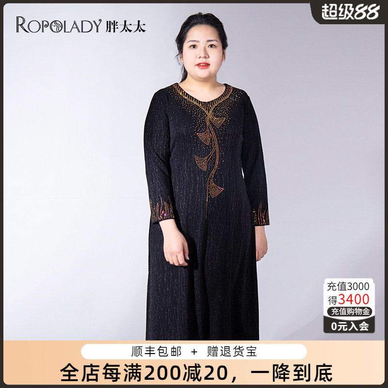 胖太太大码女装春秋新品长袖圆领镶钻中长连衣裙妈妈装822217040