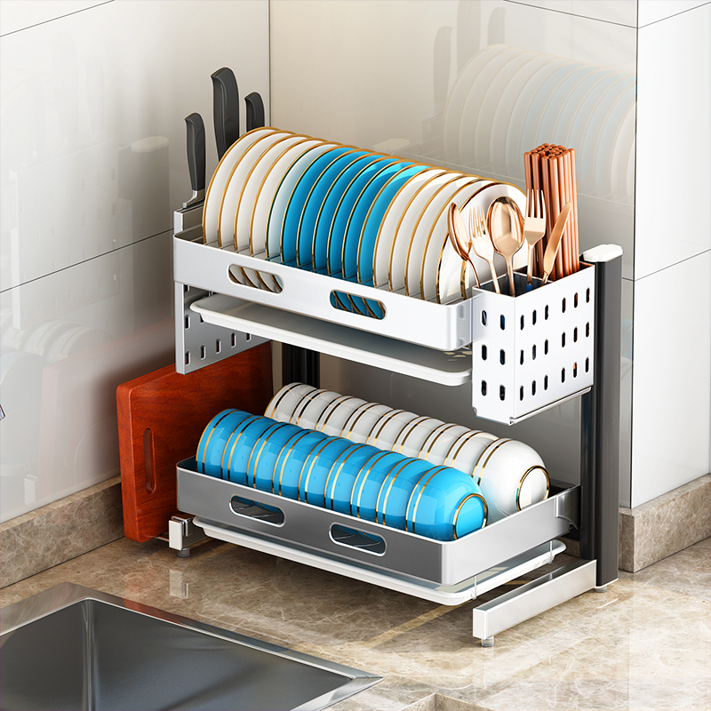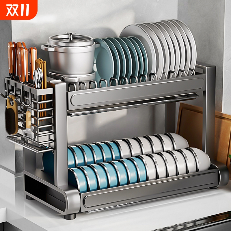 太空铝放碗架沥水架台面家用双层碗碟收纳架碗盘滴水架厨房置物架
