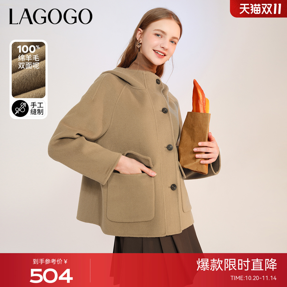 【100%羊毛】LAGOGO短款斗篷驼色大衣女拉谷谷秋冬新款毛呢外套