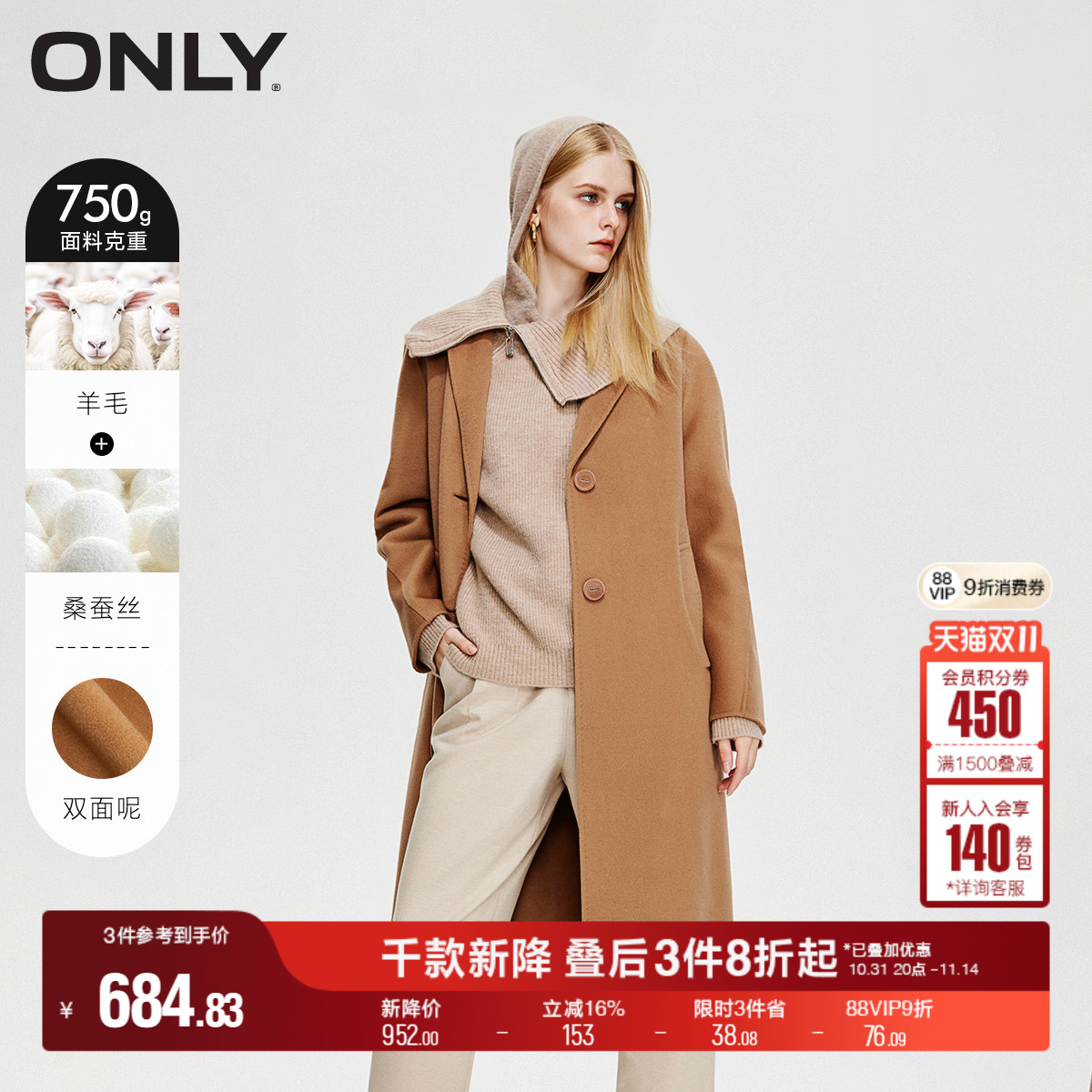 ONLY秋季绵羊毛双面呢西服领双排扣老钱风中长款驼色毛呢大衣女