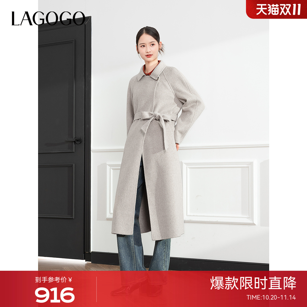 LAGOGO绵羊毛大衣女拉谷谷冬季新款浅驼色高级感优雅气质长款外套