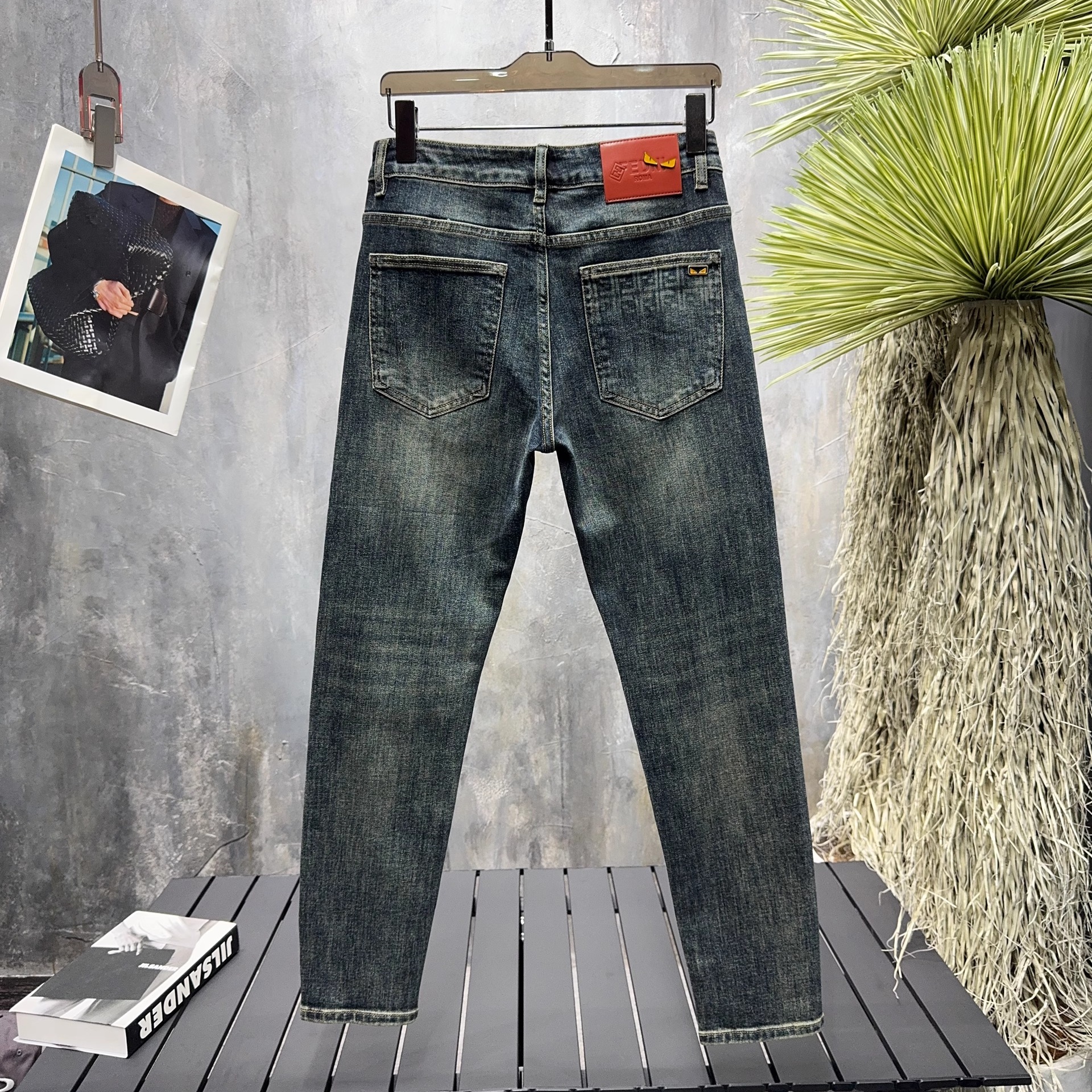 秋冬厚款男士弹力修身磨毛牛仔裤轻奢压花水洗怀旧时尚欧洲站男装