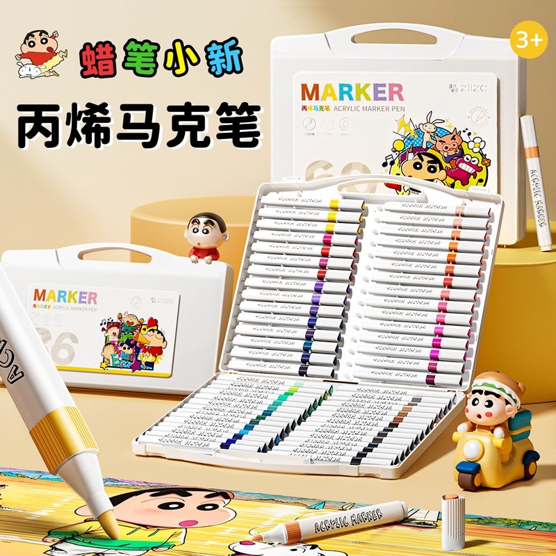 蜡笔小新丙烯马克笔小学生专用儿童不透色可叠色无毒可水洗美术24色幼儿园画笔36色水彩笔三角杆炳稀比心防水