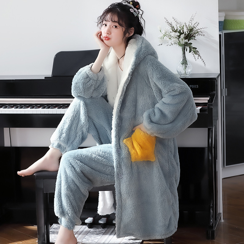 睡衣女秋冬季珊瑚绒加厚加绒睡袍长款睡裙卡通可爱学生家居服套装