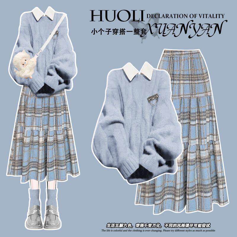 秋冬小清新套装女学生韩版宽松长袖衬衫+针织毛衣半身裙两件套潮