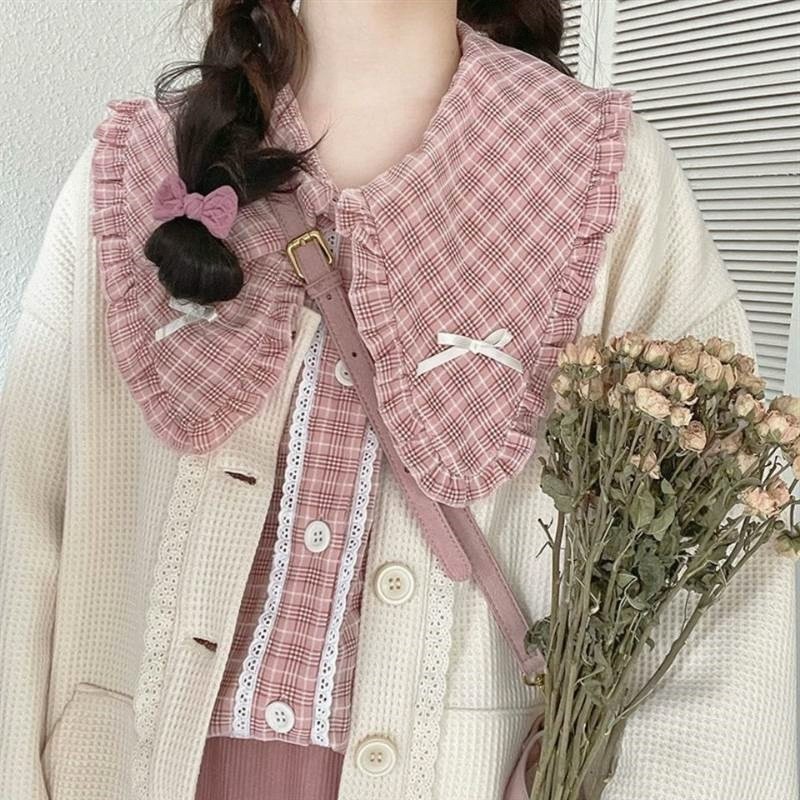 秋冬套装女学生韩版宽松小清新娃娃领卡通毛衣+格子半身裙两件套