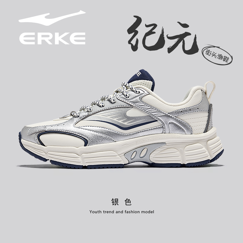 纪元鸿星尔克女鞋2025秋季新款皮面千禧年银色运动休闲慢跑通勤鞋