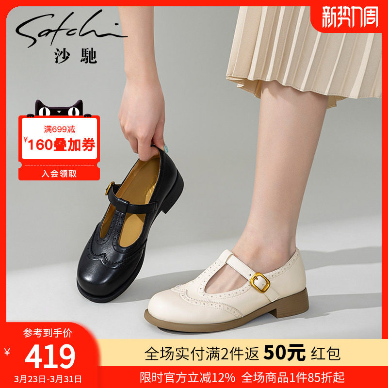 沙驰女鞋复古玛丽珍单鞋女2026新款春夏季低跟雕花布洛克小皮鞋