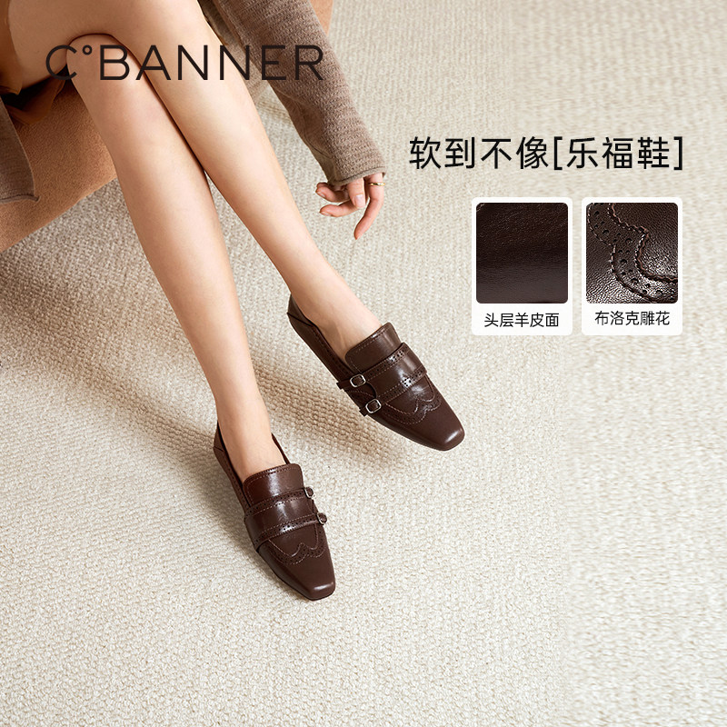 千百度羊皮英伦风布洛克小皮鞋乐福鞋女2026春季新款通勤低跟单鞋