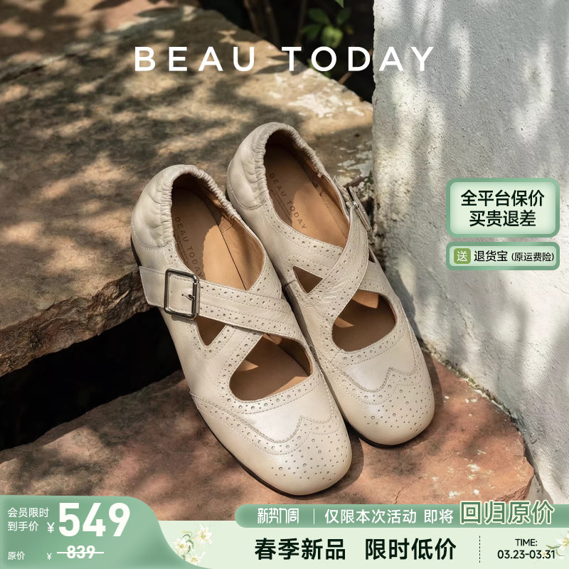 BeauToday浅口单鞋女2026春季新款白色玛丽珍鞋小皮鞋布洛克女鞋