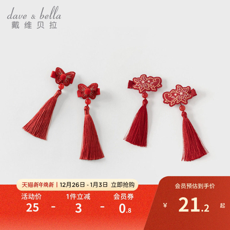 戴维贝拉女童汉服发夹2026宝宝中式流苏发饰儿童女孩新年红色头饰