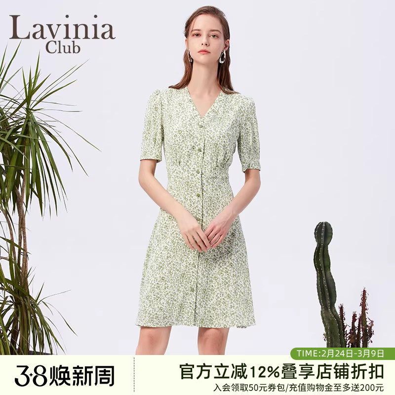 Lavinia 碎花连衣裙女夏季新款小清新高腰泡泡袖法式绿花v领裙子