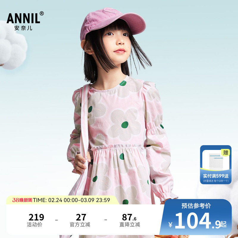 安奈儿童装女童长袖连衣裙2025春新款甜美纯棉印花小清新透气