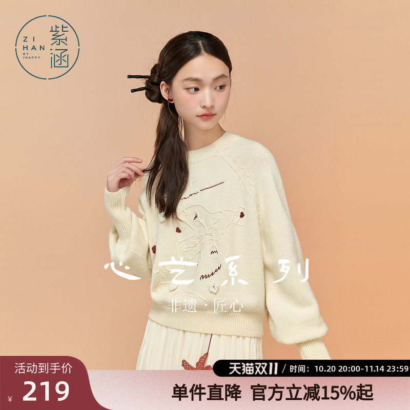 紫涵圆领套头针织衫女冬季新款手工钩花宽松慵懒感休闲长袖短毛衣