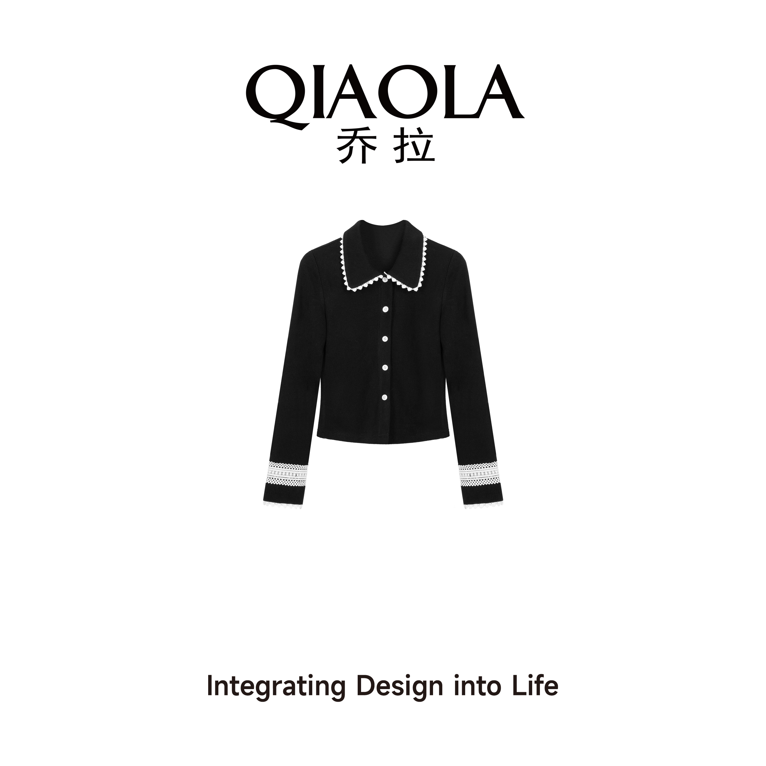 乔拉【月夜绘梦】法式赫本风黑色翻领针织衫女时尚气质显瘦短毛衣