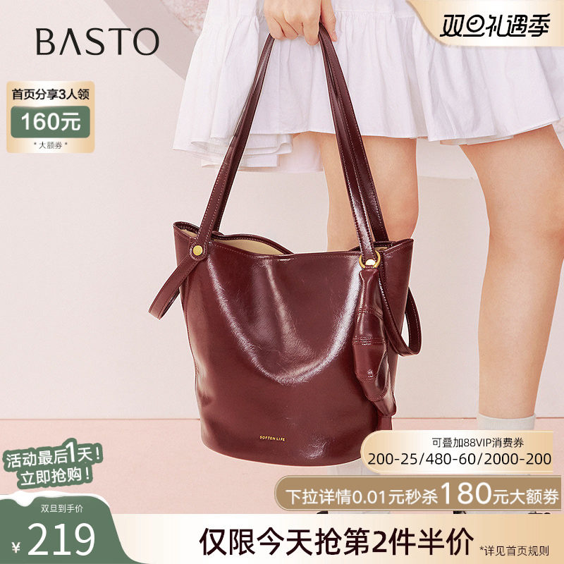 百思图2025春商场新款简约大容量红色水桶包单肩斜挎包女X3658AX5