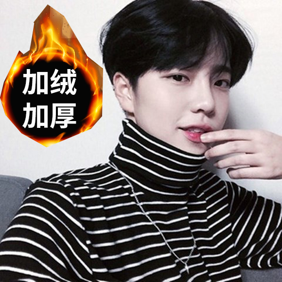 冬季加绒加厚条纹长袖男装高领打底衫保暖秋衣t恤内搭不倒绒衣服