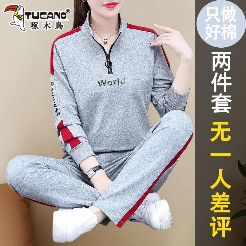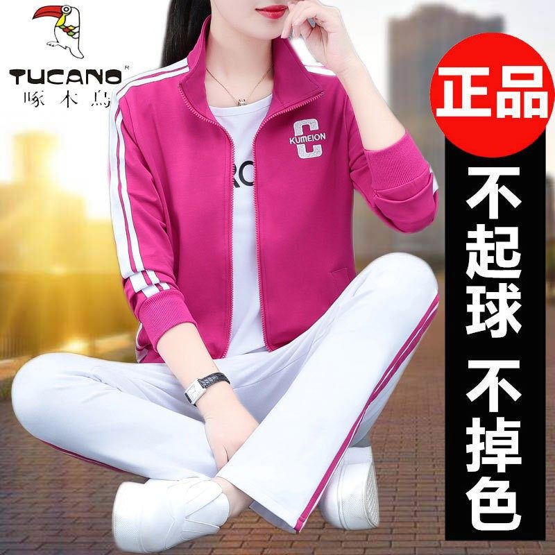 啄木鸟品牌运动套装女春秋新款外套三件套休闲妈妈装宽松跑步服女