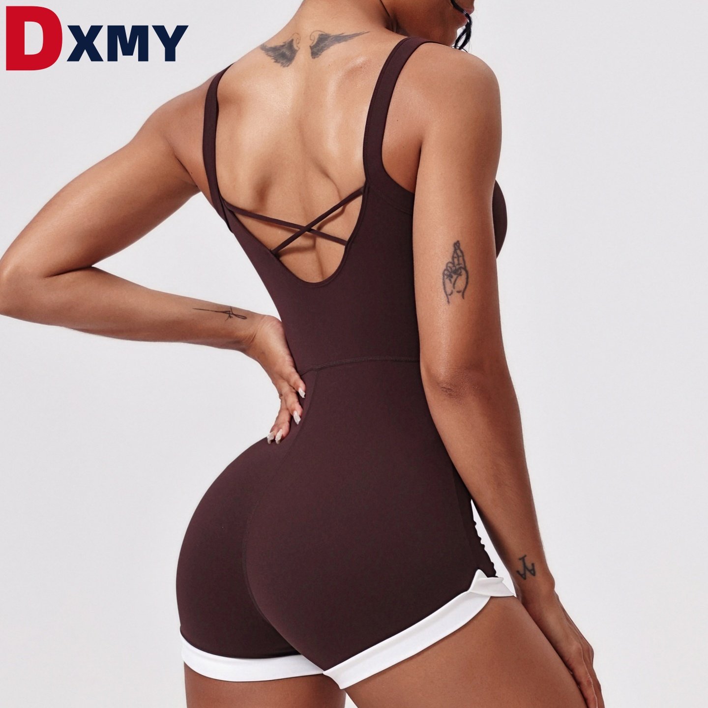 新款连体跑步服女裸感高弹短裤撞色拼接性感镂空美背宽肩带健身服