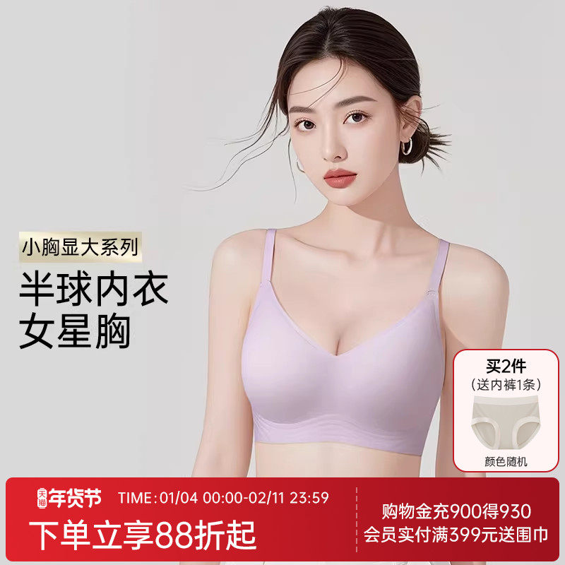 润微双提拉内衣女大胸显小防下垂透气收副乳隐形无痕粉底液文胸罩
