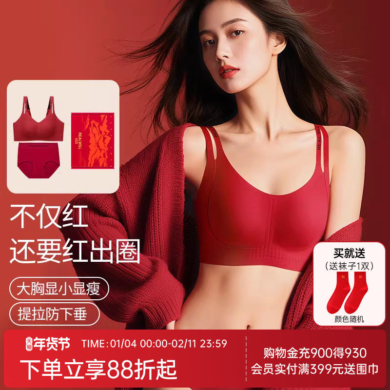 润微本命年红色内衣套装女提拉大胸显小防下垂马年结婚新娘文胸罩