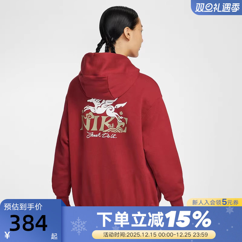 NIKE耐克女子红色卫衣马年限定CNY图案宽松连帽套头衫IQ3826-613