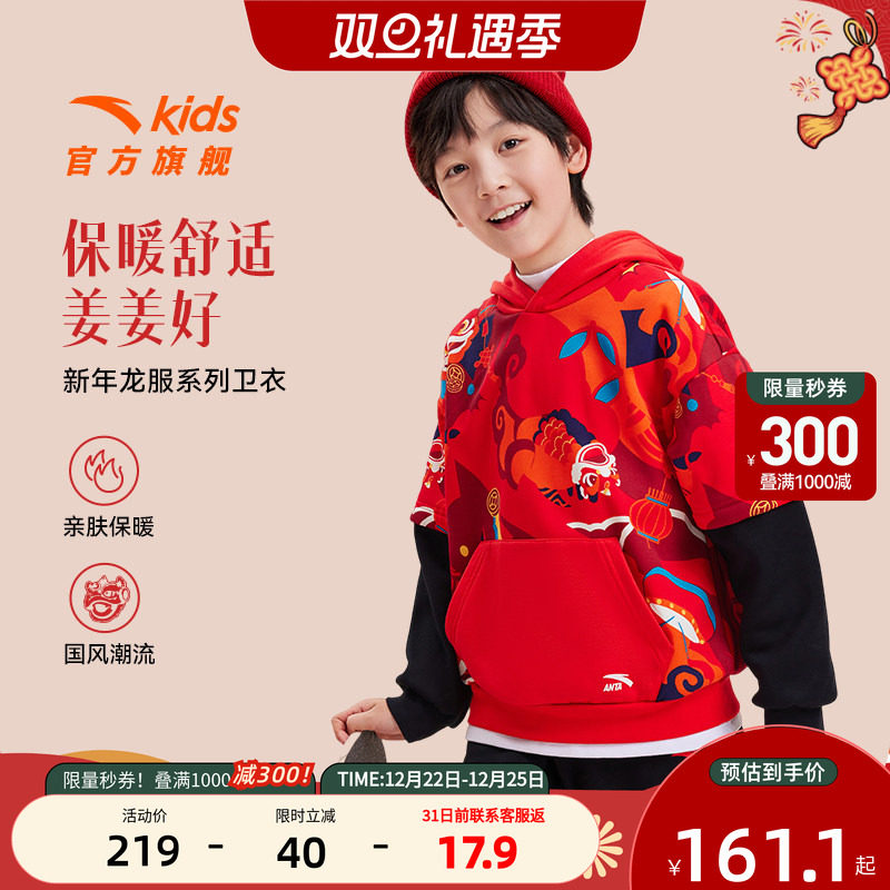 安踏儿童加绒卫衣男女大童2026新年红色连帽套头衫本命年男童衣服