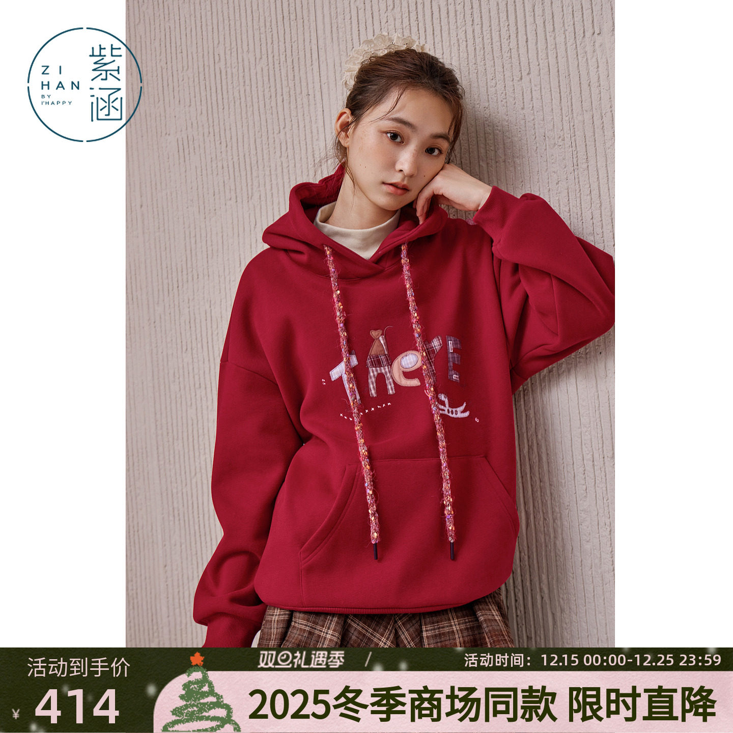 紫涵红色加绒连帽卫衣女2025年冬季新款贴布字母刺绣宽松套头上衣
