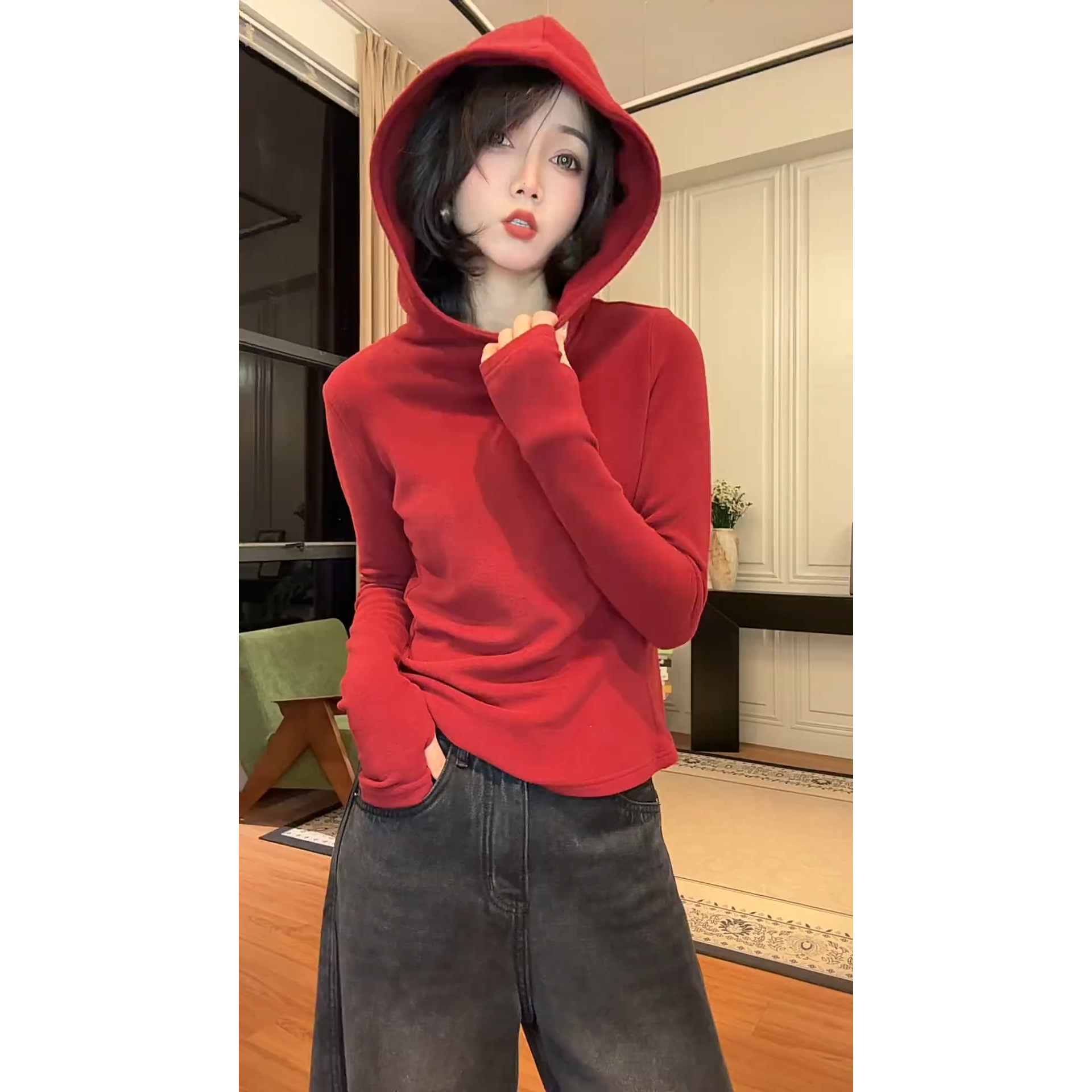 落落狷介 卫衣女冬加绒加厚2025新款红色连帽套头外套小个子宽松