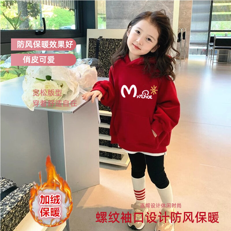女童红色连帽卫衣2025本命年秋冬新款加绒套头男童女大童加厚卫衣