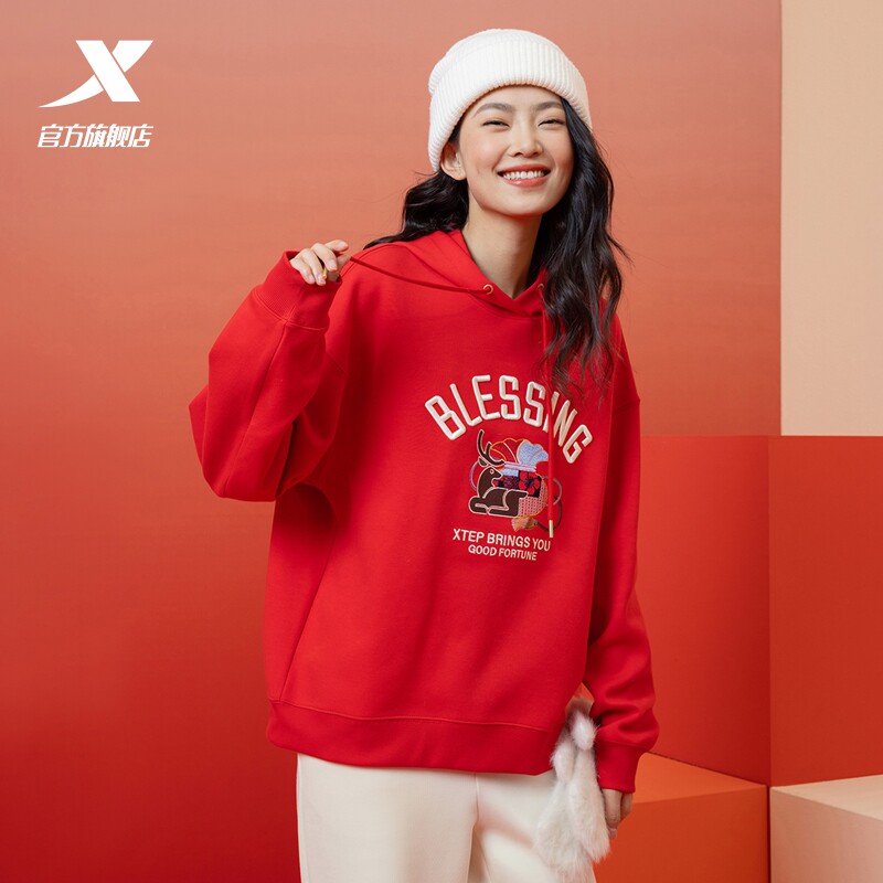 特步新春系列丨连帽卫衣女款春秋季新款红色休闲运动套头宽松长袖