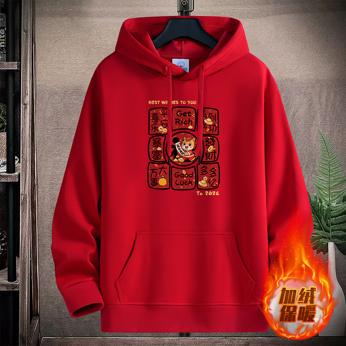 361红色卫衣男女同款2025冬季马年新年本命年连帽加绒卫衣套头衫