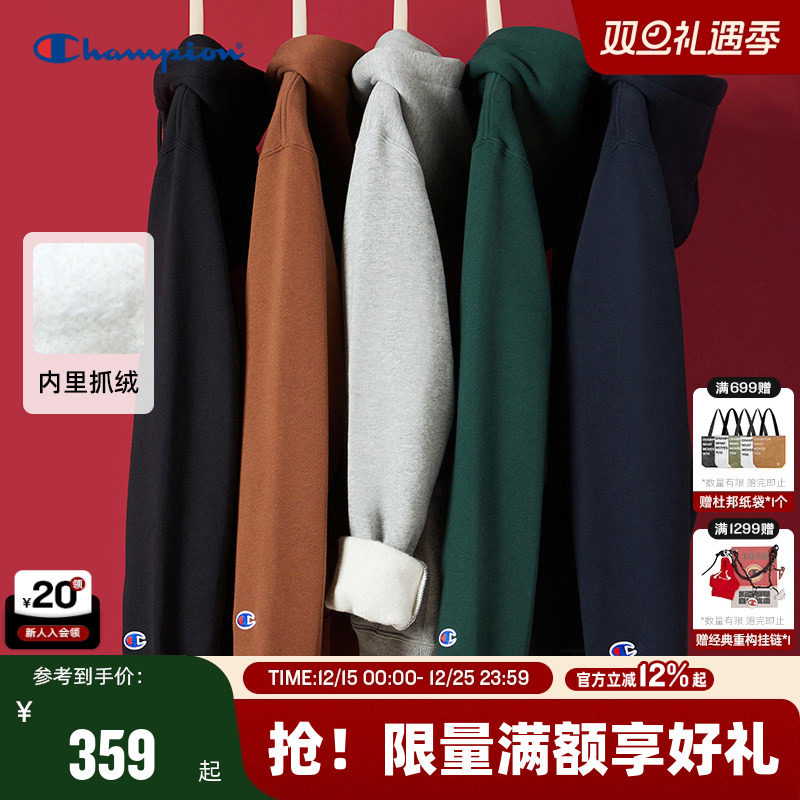 Champion冠军加绒卫衣男秋冬连帽加厚女刺绣潮牌套头上衣红色潮牌
