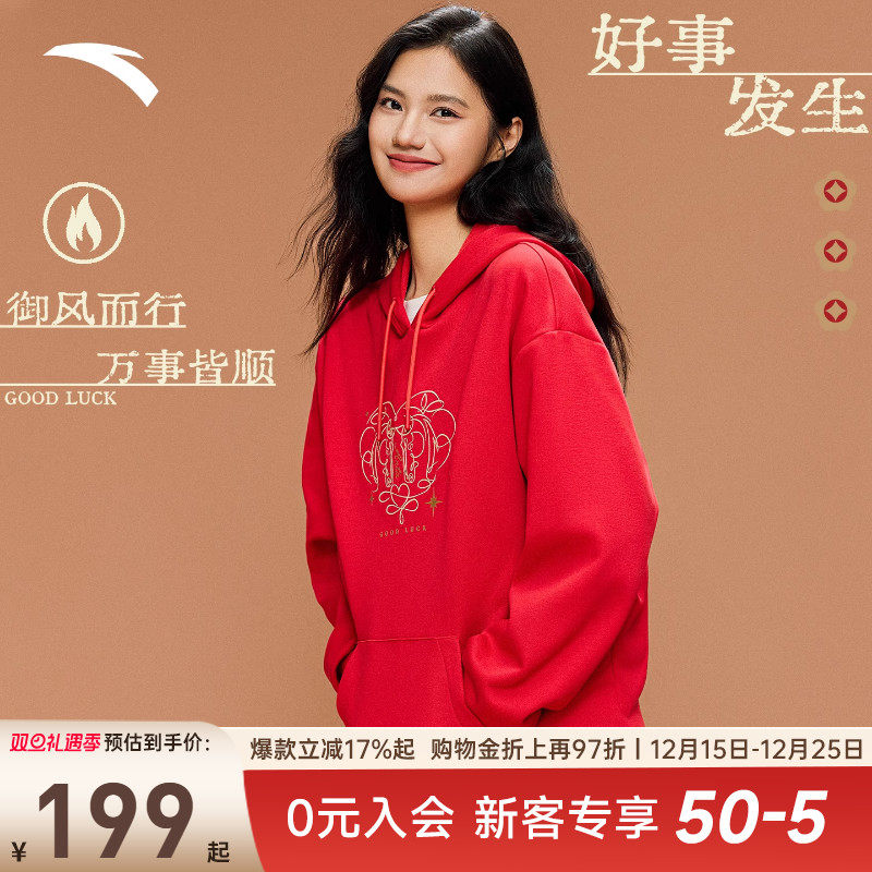 安踏好事发生丨新年款红色连帽卫衣男女休闲套头衫上衣152518725S