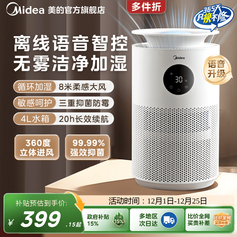 美的加湿器卧室家用静音孕妇婴儿空气净化小型大容量桌面喷雾2025