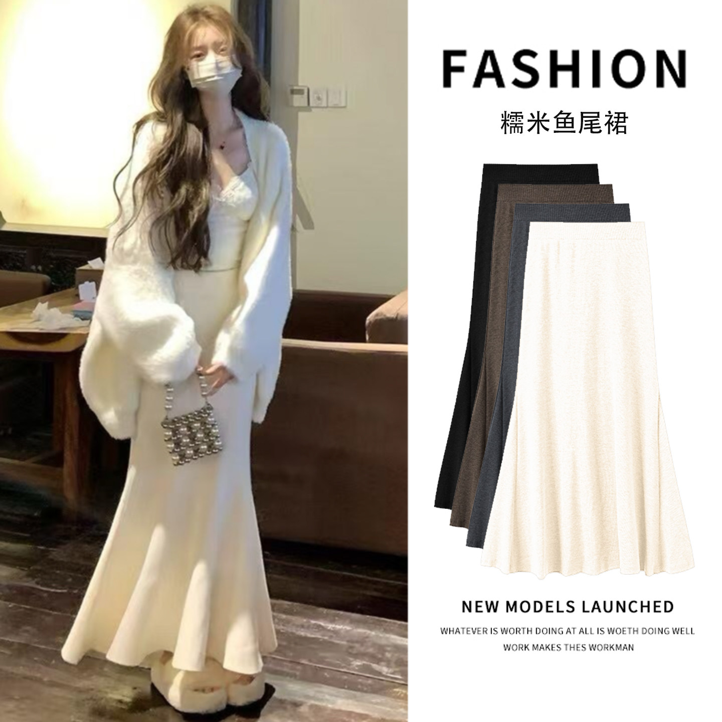 米杏色鱼尾裙半身裙女秋冬季高腰显瘦a字裙中长款针织糯米包臀裙